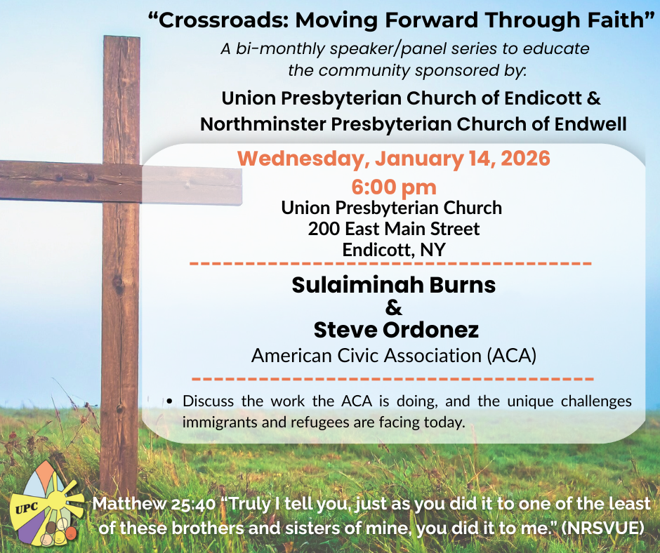 In partnership with Northminster Presbyterian Church, you are invited to join us at our next Crossroads: Moving Forward through Faith event, taking place at Union Presbyterian Church, 200 East Main Street, Endicott, on Wednesday January 14, at 6 pm. We will meet in the Fellowship Hall.