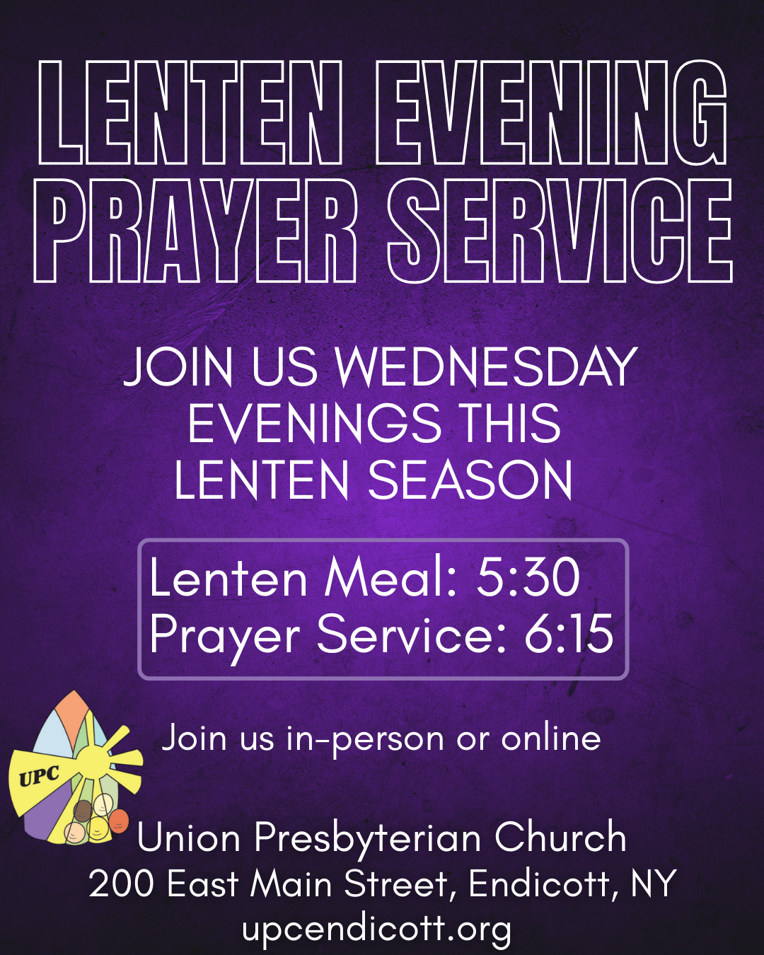 We'll begin with a Lenten meal at 5:30pm, followed by worship at 6:15pm.