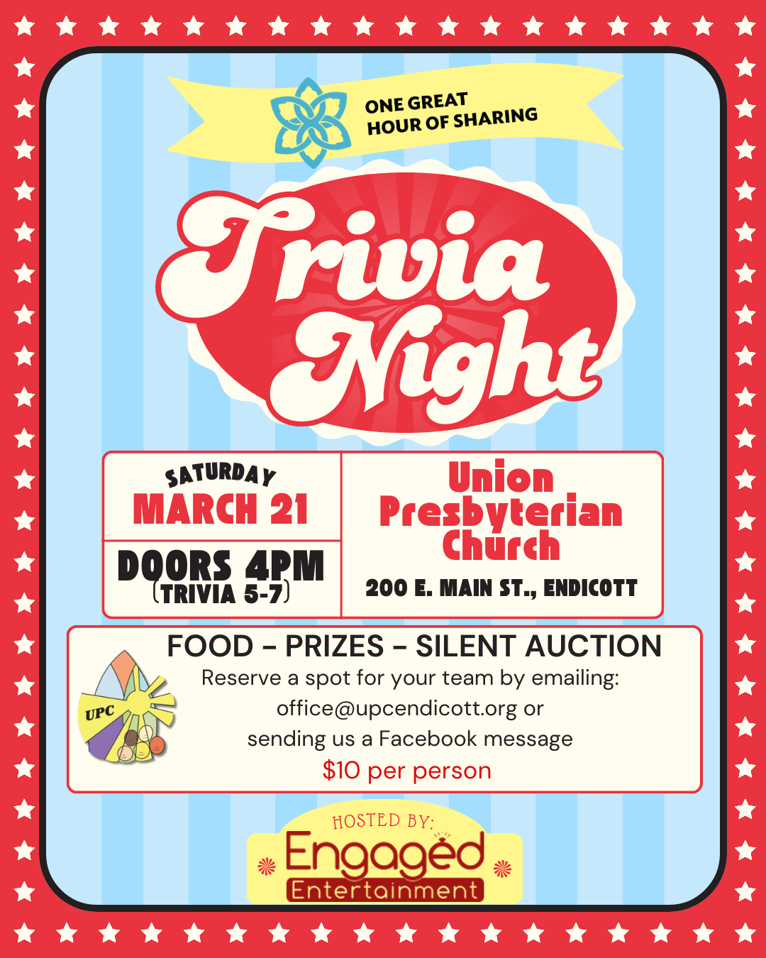 Then grab your friends and join us for our ONE GREAT HOUR OF SHARING Trivia Night!
